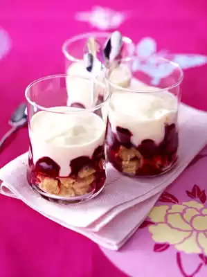 4 Crumble the shortbread in the bottom of the glasses. Spread the cherries with their juice inside, then the mascarpone preparation. Smooth the surface, cover and place in the freezer for at least 4 hours. Place the verrines 15 minutes in the refrigerator, then, grate white chocolate shavings on top and serve.