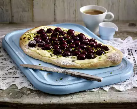 Grate marzipan, mix with mascarpone, vanillin sugar and sour cream. Stir in half the pistachios. Knead the yeast dough again and roll out to an oval (35 x 25 cm) on a floured work surface. Line baking tray with baking paper. Place the dough on top. Spread marzipan cream on top. Spread cherries on top. Bake in the preheated oven (electric range: 225 °C/ convection oven: 200 °C/ gas: level 4) for 10-12 minutes on the bottom shelf. Remove, allow to cool and sprinkle with remaining pistachios.