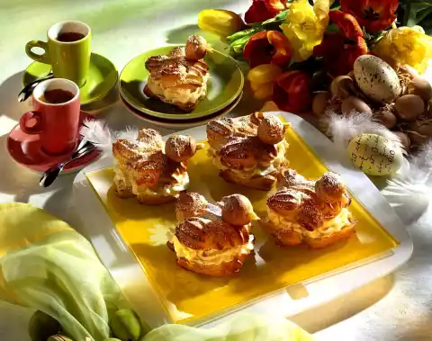 Pour the rest of the dough into a piping bag with a large perforated spout. Spray about 10 tuffs for the heads onto the tray. Bake in the preheated oven (electric cooker: 225 °C/ convection oven: 200 °C/gas: level 4) for 20-25 minutes. Cut open the chick body immediately with scissors and let everything cool down