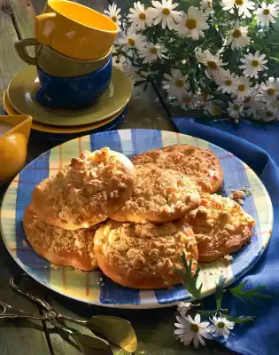 Spread the crumbles on the flat cakes. Bake in the preheated oven (electric oven: 200 °C/ gas: level 3) for 15 to 20 minutes. Results in eight pieces.