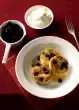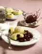 Collect the juice in a saucepan. Remove 2 tablespoons of juice and stir with the remaining sauce powder until smooth. Bring the remaining juice to the boil, stir in the sauce powder and bring to the boil again. Fold in the cherries and refrigerate. Chop the nuts. Cut the rolls roughly into cubes. Melt butter in a pan. Fry rolls until crispy while turning. Add 2 tablespoons sugar and nuts and fry briefly.