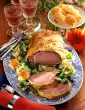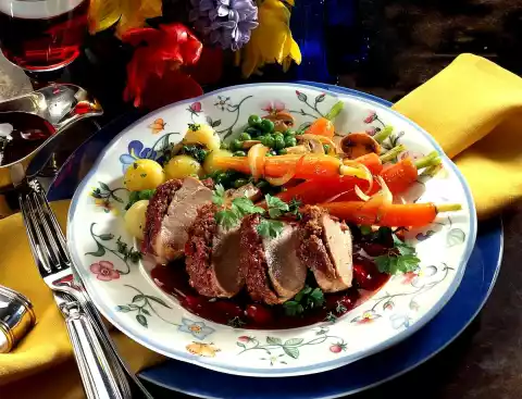 Wash the meat and dab dry. Fry all around in hot oil. Keep the meat. Season with salt and pepper. For the crust, crumble brown bread and mix with 2 tablespoons of cherry jam and egg.