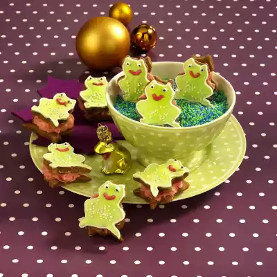 Quickly mix the sugar, egg, flour, cocoa and butter in flakes with the dough hooks of the hand mixer to a smooth dough. Wrap in foil and chill for approx. 30 minutes. Roll out the dough 2-3 mm thin on a floured work surface and cut out 50 frogs (5 x 4.5 cm). Place on 2 baking trays lined with baking paper. Bake the trays one after the other in a preheated oven (electric cooker: 175 °C/ convection oven: 150 °C/ gas: level 2) for 8-10 minutes. Remove from the oven, place on a cake rack and allow to cool.