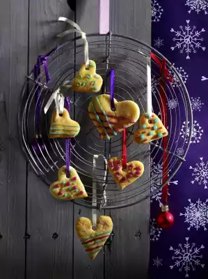 Bake one after the other in a preheated oven (electric cooker: 175 °C/ convection oven: 150 °C/ gas: level 2) for about 15 minutes. Take out and let cool down. Decorate with sugar decoration cream and let dry. Pull ribbons in different colours through the holes and hang up heart cookies