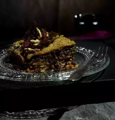 Finely grind the cooled pesto-caramel mixture in the universal chopper. Spread thinly on a baking tray lined with baking paper to make 4 squares. Take the finished lasagne out of the oven and put the sugar mixture in the oven for 2 minutes until the sugar starts to melt and run into each other.