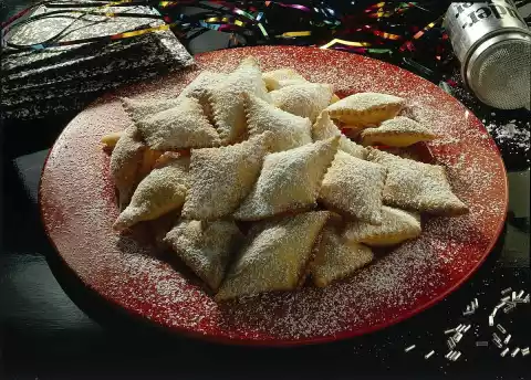 Use a cake wheel to cut out 8 cm long and 5 cm wide rhombs. Heat the fat in a high pot to 180 °C. Fry the rhombs in it in portions for about 3 minutes until golden brown. Drain on kitchen paper.