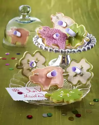 Roll out the dough on a floured work surface to a thickness of about 3 mm. Cut out a total of approx. 16 piglets (approx. 5 x 8 cm) and cloverleaves (approx. 6 cm Ø) and cut a hole in the middle with a punched spout (1.4 cm Ø). Knead the remains again and again, roll out again. Spread the biscuits on 2 baking trays lined with baking paper. Bake one after the other in a preheated oven (electric cooker: 175 °C/ convection oven: 150 °C/ gas: level 2) for 12-14 minutes. Remove the cookies, place them on a cake rack with the baking paper and let them cool down