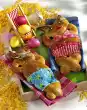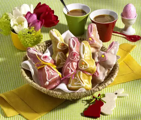 Fill approx. 2 tablespoons of white icing into a piping bag. Stir the rest of the icing thinner with approx. 1 tablespoon of hot water and divide into three. Colour 1/3 pink and 1/3 yellow. Leave 1/3 white. Cover rabbits with it and let them dry. Cut a small corner off each piping bag. Paint contours on the rabbits with the icing and put sugar pearls as eyes