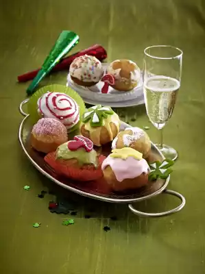 Decorate donuts as you like, e.g. turn them in sugar and fill with the jam. Or fill with jam first, let it cool down a little. Then decorate with small figures cut out of coloured marzipan or with coloured icing and sugar pearls