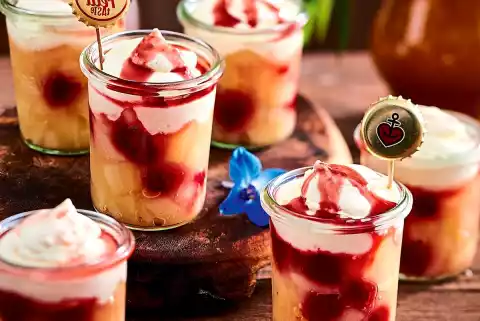 Divide the compote into ten glasses (each containing approx. 125 ml). Spray mascarpone cream on top. Put it in a cold place. Just before serving, drizzle either crème de cassis or raspberry syrup over the cream.