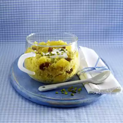 Stir the fat into the couscous, steam over a low heat for 2-3 minutes, remove from the heat. Peel the rest of the orange quarters. Cut flesh into small pieces. Stir the sultanas and orange pieces into the couscous and pour into a glass. Add yoghurt and sprinkle with pistachios