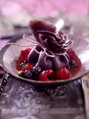 Heat 1 teaspoon of oil in each case in a coated pan (approx. 18 cm Ø) and bake 4 pancakes one after the other at medium heat. Put 1 pancake in each small bowl and put about 1 tbsp. of whipping cream in the middle of each. Lift the pancakes up around the filling, form them into a packet and tie them together with kitchen string. Arrange 1 packet with the berries and syrup on plates