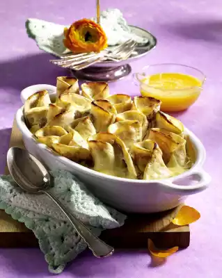 Bake in the preheated oven (electric cooker: 175 °C/ convection oven: 150 °C/ gas: level 2) for about 20 minutes. In the meantime drain and puree the peaches. Serve the finished casserole and peach sauce together.