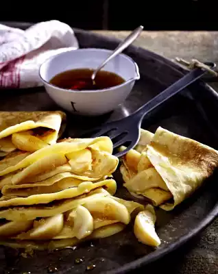 Heat approx. 1/8 of the fat in a pan (approx. 24 cm Ø) and fry approx. 1/8 of the dough in it to a pancake. Remove and repeat the process with the remaining fat and dough. Lift the pears out of the syrup, spread them on the pancakes and fold them into triangles.