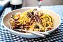 Peel, wash and cut the potatoes into pieces. Cover and cook in salted water for about 15 minutes. In the meantime peel and finely dice the onions. Peel, wash and chop the carrots. Rinse and drain the prawns. Rinse fish, dab dry and cut into approx. 3 cm cubes.