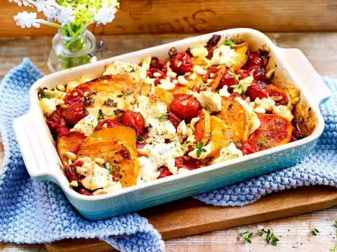 Take the sweet potatoes out of the oven. Add the tomatoes. Crumble feta over it. Sprinkle with pine nuts. Bake in a hot oven (electric cooker: 200 °C/ convection oven: 175 °C/ gas: see manufacturer) for another 10-15 minutes. Take the casserole out of the oven. Sprinkle with coarse pepper and serve.