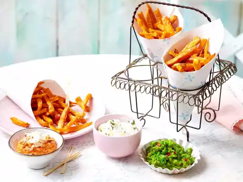 Keep ready fries warm in a hot oven. Season sweet potato fries with sea salt and serve with the dips.