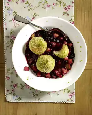Add the apples and simmer for 2-3 minutes. Mix breadcrumbs and 3 tablespoons of sugar. Remove the dumplings and roll in the mixture. If necessary, reheat compote again and arrange with the dumplings in preheated plates. Sprinkle dumplings with pistachios