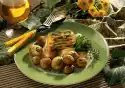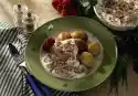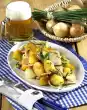 Mix 750 ml cold water and 2 tablespoons of sugar. Stir in potato dumpling powder with a whisk and let it swell for about 10 minutes. Form 12 dumplings from the dumpling dough with moistened hands and put them into boiling, slightly sugared water, bring to the boil briefly and let them simmer for 15-20 minutes at low heat. Meanwhile wash apples, remove core and dice flesh. Caramelise 3 tablespoons of sugar in a pot until golden brown. Add 100 ml of water and berry mixture and boil sugar until it comes to a boil.
