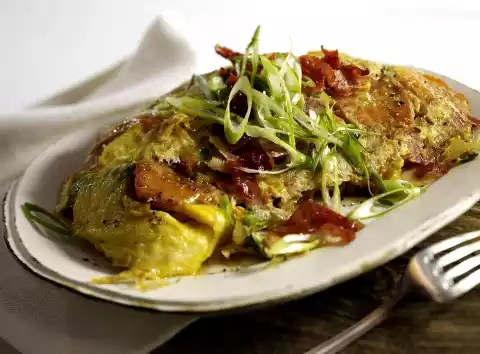 Spread the remaining ham cubes and onion slices on the omelettes.