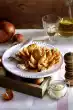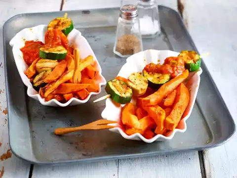 Season with salt and pepper. Puree coarsely with the cutting stick. Take the chips out of the oven, add the skewers and curry sauce.