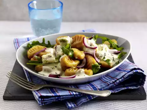 Clean, wash and drain the rocket. Melt butter. Add gnocchi and rocket and toss in the butter for 1-2 minutes, season with salt and pepper. Arrange gnocchi, rocket and sauce on plates and sprinkle with remaining gorgonzola.