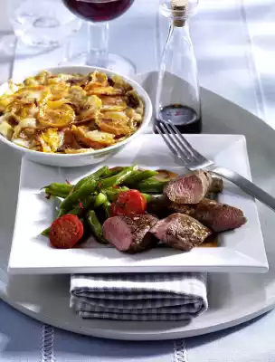 Serve gratin with the meat, beans and tomatoes. Add the soy sauce. Dip the beans into it during the meal or drizzle the sauce over them.