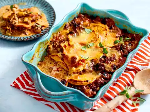 Pour some cream on the bottom of a casserole dish. 1⁄3 Layer sweet potato slices, half minced meat and half feta. Again 1⁄3 Add sweet potatoes, repeat layering and finish with sweet potatoes. Pour half the cream over the top two sweet potato layers. Cut the mozzarella into slices and spread on top. Bake in a hot oven for about 50 minutes. If necessary, bake in the last approx. 1