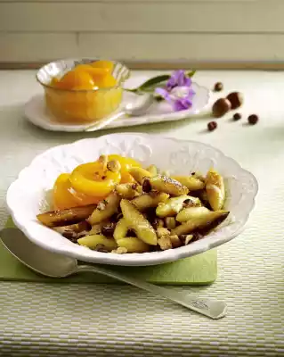 Sprinkle 2 tablespoons of sugar over it and let it caramelize a little. Arrange the potato noodles with some apricot compote on plates. Add the rest of the compote.