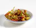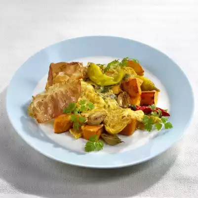 Peel and wash the potatoes. First cut into slices of about 1 cm thickness, then quarter them. Cook in boiling salted water for about 8 minutes and drain. In the meantime peel the shallots and cut them in half lengthwise. Dab the peppers carefully dry. Whisk eggs and cream.
