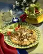 Pour 1/4 of the egg cream over them. Leave to set at low heat. Turn once, fry briefly. Keep the omelette warm and prepare the remaining ingredients in the same way. Cut ham slices in half lengthwise. Melt butter in a wide pan. Fry the ham until crispy and arrange on the omelettes in portions. Serve garnished with chervil and red chillies