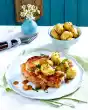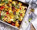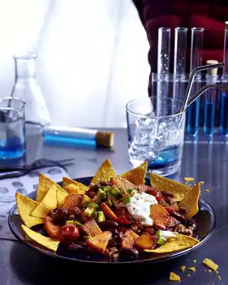 Arrange sweet potato pan, spread sour cream and avocado on top. Sprinkle with some chilli. Spread chips on the plates around the sweet potato pan.