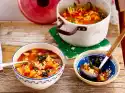 Pour the beans into a sieve, rinse and drain. Peel and roughly dice the onions. Peel garlic and chop finely. Heat 2 tablespoons of oil in a large frying pan. Sauté the sweet potatoes for about 3 minutes while turning them. Take out. Put 1 tbsp. oil in the pan and fry the minced meat for about 1 minute, turning it over. Add onion and garlic and fry for about 2 minutes, turning occasionally. Season with salt and pepper. Add tomatoes and beans, add broth, bring to the boil and simmer at medium heat for about 5 minutes.