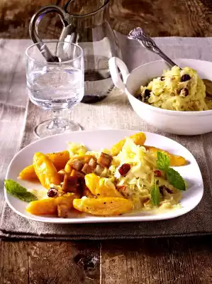 Peel and chop the onion. Heat 1 tablespoon of oil in a saucepan. Fry the onions for about 3 minutes. Add the sauerkraut and fry briefly. Add wine and stock. Add 4 tbsp. agave syrup, cumin, saffron, chilli, vanilla pod and pulp, bring to the boil once and simmer for about 10 minutes.