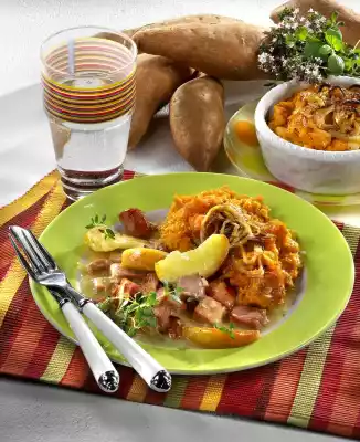Cut apples into slices. Wash thyme, dab dry and pluck the leaves from the stems. Heat 50 ml broth, milk and butter in a small pot. Drain the potatoes. Mash them with a potato masher and add the milk and fat mixture. Pour the puree into ovenproof dishes, spread onion rings on top and sprinkle with sugar. Bake in the preheated oven (electric cooker: 200 °C/ convection oven: 175 °C/ gas: level 3) for 12-15 minutes. In the meantime heat oil in a pan. Fry the cured pork loin thoroughly on all sides. Add the diced onion, thyme and apples and fry briefly. Dust with flour, sweat briefly and deglaze with 500 ml stock, bring to the boil, simmer for 2-3 minutes at low heat. Then season to taste with salt and pepper.