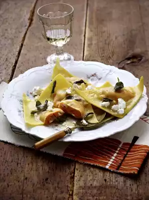 Cut the dough into 4 x 4 approx. 10 cm squares. Place approx. 1 heaped teaspoon of filling on each dough corner, leaving an approx. 1.5 cm wide rim. Spread the edges of the dough all around with egg white and fold the opposite corner over the filling. Press the edges of the dough well together. Place the finished ravioli on a floured baking tray. Roll out the remaining half of the dough like the first one and fill