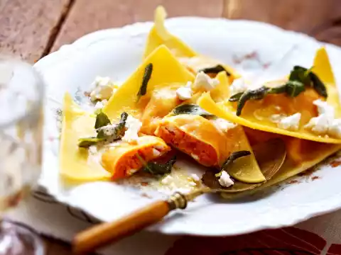 In the meantime, wash the sage, dab dry, remove the leaves and possibly cut into strips. Froth butter and sage briefly in a pan. Heat the ravioli in the sage butter. Serve with the rest of the cream cheese.