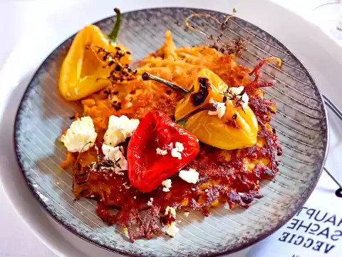 Arrange 1 Rösti and 3 peppers on plates. Garnish with roasted herbs