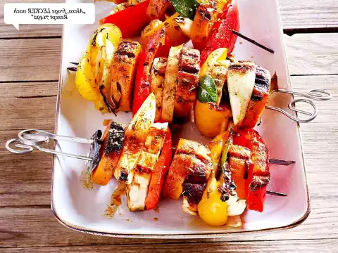 Peel and wash the sweet potatoes and boil them in salted water for about 20 minutes. Cut Halloumi into 8 slices. Clean, wash and cut the peppers into 8 large pieces. Peel onion and cut into 12 slices.