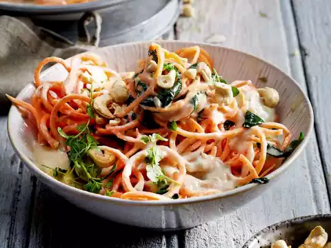 Peel, wash and dry the sweet potatoes. Cut into long, fine strips (spaghetti) with a spiral slicer. Cook in plenty of boiling salted water for about 3 minutes. Drain and let drain. Coarsely chop the seeds. Heat the sauce again. Mix sweet potato spaghetti and sauce, arrange on a plate and sprinkle with oregano and seeds.