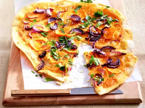 Bake in the preheated oven (electric cooker: 250 °C/ convection oven: 225 °C/ gas: see manufacturer) for approx. 10 minutes. Do the same with the remaining ingredients. In the meantime wash parsley, shake dry, pluck leaves from the stalks and chop. Sprinkle the finished tarte flambée with parsley