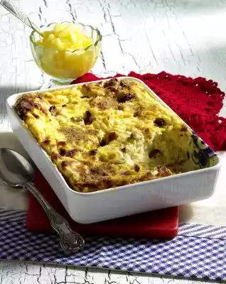 Bake in the preheated oven (electric cooker: 200 °C/ convection oven: 175 °C/ gas: level 3) for 25-35 minutes. Mix cinnamon and 3 tablespoons of sugar. Sprinkle the casserole with cinnamon sugar and serve with the compote.