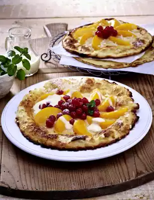 Remove and keep warm. Fry 3 more pancakes in the same way. Arrange the pancakes on plates and decorate with currants. Dust with icing sugar and decorate with mint. Serve with vanilla sauce