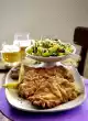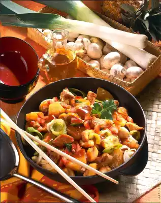 Season with salt and pepper. Add onion, leek, mushrooms and pineapple and fry for another 5 minutes. Deglaze with stock and marinade and bring to the boil. Add 5-6 tablespoons pineapple juice, lemon juice, vinegar and ketchup and season with soy sauce, sugar, sherry, Chinese spice and paprika.