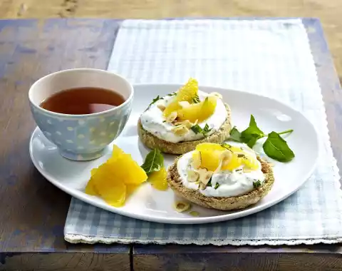 Mix quark, mint, honey and 1-2 tablespoons orange juice. Halve the toasti and toast. Cover with quark and orange fillets. Sprinkle with hazelnut leaves