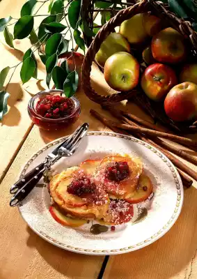 Place in hot fat and press the slices of bread on top of it a little. Fry for about 2 minutes, turn carefully and fry again for about 3 minutes. Serve with cranberries. Sprinkle with sugar crystals and a little cinnamon.
