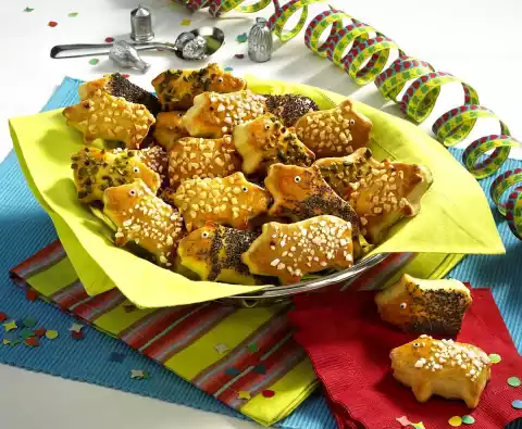 Add 85 g sugar, salt, vanillin sugar and egg to the flour and knead first with the dough hooks of the hand mixer, then with your hands to a smooth yeast dough. Cover and leave to rise in a warm place for about 30 minutes. Line 2 baking trays with baking paper. Knead the yeast dough again with floured hands, then roll out 8 mm thick on a floured work surface. Cut out pigs with a pig cutter (approx. 8 cm long and 5 cm high) and place them on the baking trays. Whisk egg yolk and cream. Brush the pigs with the egg cream and sprinkle with chopped pistachios, almonds, sugar crystals or poppy seeds. Leave out the head. Bake the trays one after the other in a preheated oven (electric cooker: 200°C/ convection oven: 175°C/ gas: level 3) for approx. 13 minutes. Knead the rest of the dough again and process in the same way.