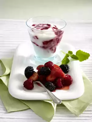 lemon juice. Pour the gelatine into the kefir while stirring and chill for approx. 10 minutes. In the meantime, sort out the raspberries, weigh 150 g, add 20 g sugar and puree. Squeeze 2 sheets of gelatine, dissolve and stir into the raspberries. When the kefir starts to gel, spread about half of the cream in 4 glasses. Add 2/3 raspberry puree and cover with the remaining kefir cream. Add a blob of raspberry puree to each glass and draw it through spirally with a fork or spoon. Put the cream in a cool place for at least 1 hour. Wash the strawberries and blackberries and drain well. Clean and halve the strawberries.