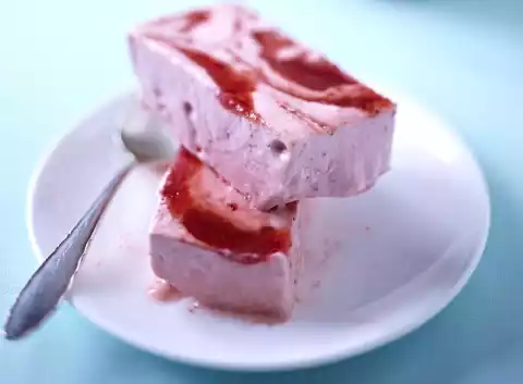 Stir in the strawberry puree bit by bit, continue stirring for 2-3 minutes. Whip cream until stiff, fold in. Pour mixture into a mould lined with foil (approx. 25 x 13 cm), smooth it down, freeze for 30-40 minutes