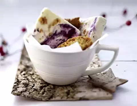Puree blueberries and 100 g sugar with a hand blender. Mix 1/3 parfait mass with the blueberry puree. Pour the light vanilla parfait mixture into the mould. Add the blueberry parfait mass and pull it through lightly with a fork so that streaks appear.